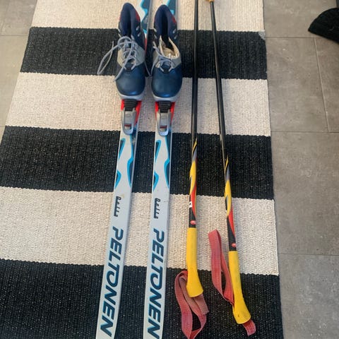 Yhdellä lapsella olleet, vähän käytetyt ja todella hyväkuntoiset Peltosen sukset. Sukset 118cm ja sauvat 90cm.