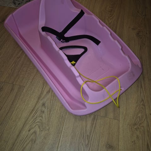 Kotimainen vauvanpulkka, sininen. Turvavyöllä varustettu istuin. Vetonaru kahvalla.