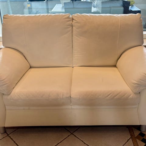 Valkoinen nahkasohva. Pohjan kangas rikki ja siksi kohtalainen kunto, ei haittaa käyttöä.