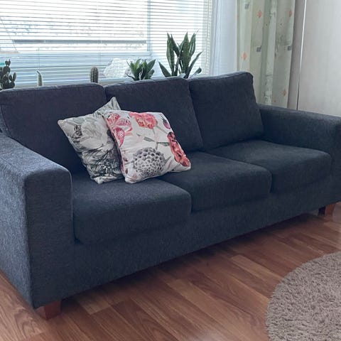 Iskun kaareva sohva antrasiitti alcantara jäljitelmä verhoilulla. Sohva koostuu kolmesta osasta, kulma divaanin syvyys 115cm ja istuin korkeus 45cm. Sohvassa käytön jälkiä, kuvan pikku tyynyt kuuluvat kauppaan. Maailman paras löhösohva.