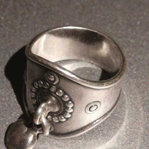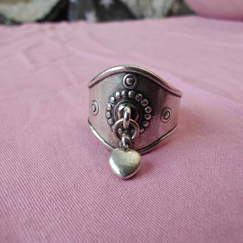 Kalevala sormus naisille. Materiaalina hopea. Sormuksessa on leveä, muotoiltu runko ja etuosassa koristeellinen kohokuviointi. Etuosaan on kiinnitetty pieni, riippuva sydänriipus. Sopii käytettäväksi arjessa tai juhlatilaisuuksissa asun yksityiskohtana. Koko n. 16