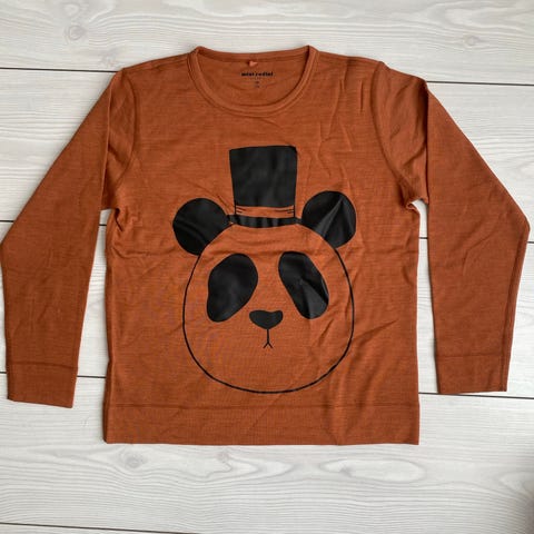 Mini Rodini lasten paita, koko 128, unisex-mallia. Vihreä pitkähihainen paita, jossa edessä painettu pandakuvio silinterihatulla. Painokuviossa kulumaa. Materiaalina merinovilla, joka on pehmeä ja hengittävä. Helmasta paikattu reikä. Käytetty kunto ja jotain tahroja saattaa olla.