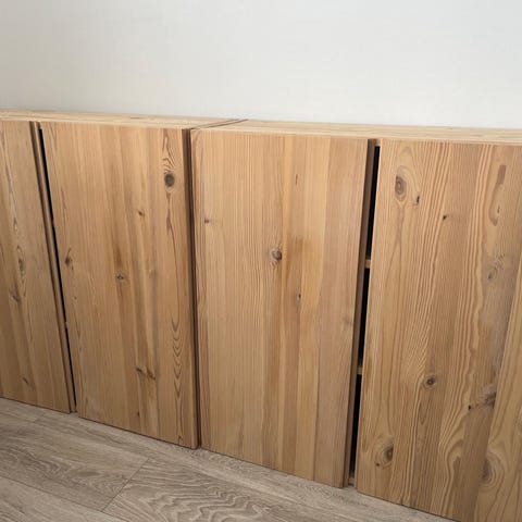 Itse petsattuja osia 200cm korkeat pystyt ja 80cm leveät hyllyt yhdessä hyllyssä kaksi vetolaatikkoa alapuolella kiinni.