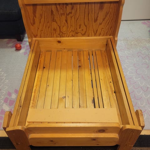Ikean "Neiden" 90x200 mäntyinen sängynrunko plus sälepohja. Ei patjaa. Pari oranssia tussinjälkeä rungossa.