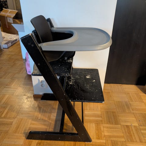 Pintanaarmuja reunoissa tarjottimen alla, jotka tulleet juurikin tarjottimen laittamisesta ja irrottamisesta (katso kuvat). Myös tarjoittimen reunassa muutama pieni naarmu. Muutoin tuoli on todella siisti ja täysin ehjä. Yhdellä ollut käytössä.