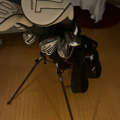 Wilson golfbägi jalustalla. Väritys musta–keltainen. Laukussa on useita vetoketjullisia taskuja palloille ja tarvikkeille sekä kantohihnat olalla kantamista varten. Raudat 5-9, S ja P mukana. Putteri hyvässä kunnossa kuten muutkin raudat. Ainoat ”virheelliset” asiat mailoissa on lika. Settiin kuuluu viimeisimpänä hybridi, puu ja driveri, joihin on huput. Kaupan päälle tulee myös tiit ja pallot.