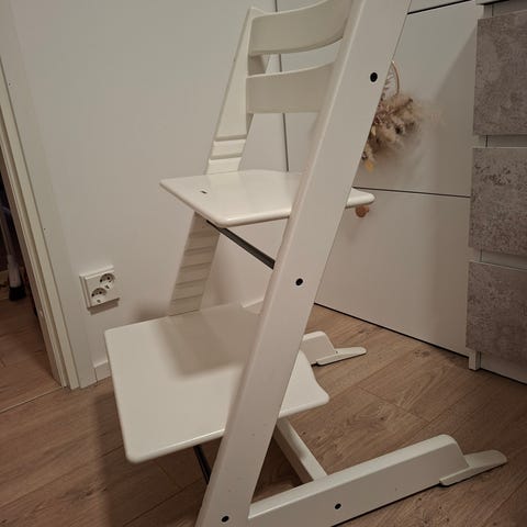 Valkoinen Stokken Tripp Trapp all in one-setti +pehmusteet ja valjaat.