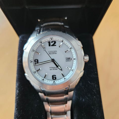 Eco Drive kello, joka lataa akkunsa valon voimalla, eikä näin ollen tarvitse paristojen vaihtoa. Pitää hyvin virran, vaikka olisi pidempäänkin pimeässä.