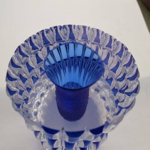 Art Nouveau-tyylinen maljakko, jalustassa kaiverrus 6.8.1917. Pohjassa numerointi 272. Turkoosiin vivahtava, irrallinen lasimalja. Harvinaisuus.