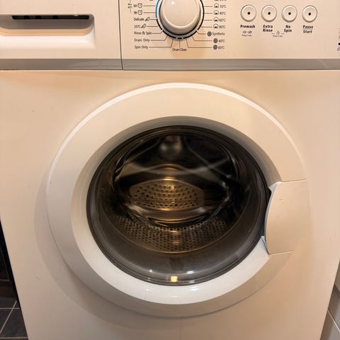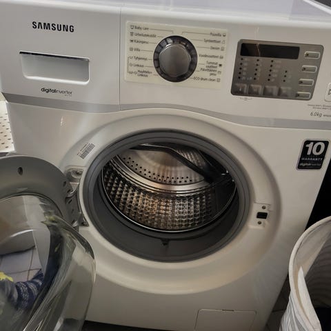 Edestä täytettävä pieni pesukone, käytössä ollut alle vuoden ja toiminut ilman ongelmia (ostettu toukokuussa 2025).