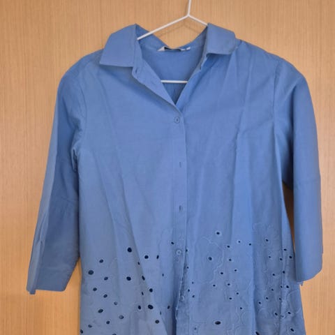 Koko 40, kai-kai 50 cm ja olka-halma 62. Materiaali ei jousta, ja paita on parhaimmillaan väljästi laskeutuen.