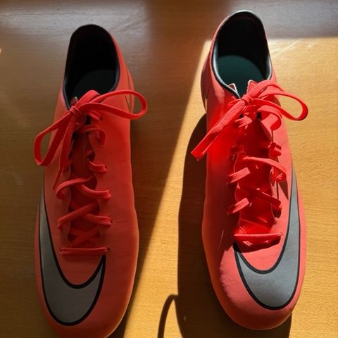 Nike jalkapallokengät, koko 43. Väri musta keltaisilla yksityiskohdilla ja nappulapohjalla. Kenkien päällinen on synteettistä materiaalia, nauhakiinnitys. Koko kengissä lukee 44,5 mutta todellinen koko pienempi, ei mahtunut 44 jalkaan.