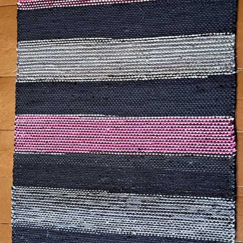 Käsinkudottu aito räsymatto kotikuteista. Raidat sinistä, vihreää, keltaista, punaista ja mustaa. Siistit,suorat reunat ja napakka kudos sekä kestävät helmisolmuin solmitut päät.