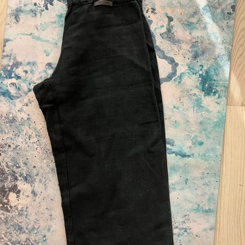 Pellavahousut koossa S. Kuminauhavyötärö, kangas itsessään ei ole venyvää. Vyötärön 1/1 mitta noin 37 cm. Lahkeen pituus noin 70 cm. Sivutaskut.
