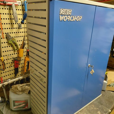 Hyväkuntoinen työkalukaappi, kaksi hyllyä liukukiskoilla. Lukko toimii ja jopa avain tallella.