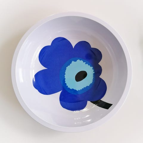 Marimekko kulho, jossa sininen kukkakuvio valkoisella pohjalla. Kovempaa muovia. Soveltuu esimerkiksi tarjoiluun tai kattaukseen keittiössä ja ruokapöydässä. Kulhon ulkopinta on valkoinen ja sisäpohjassa on suuri sininen kukka-aihe.