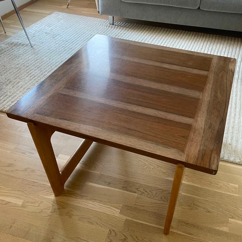 Tiikkiviilutettu ruotsalainen sohvapöytä, jossa kaunis rottinkipunottu välitaso.