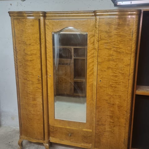 Myydään vanha, tammirunkoinen jugend-tyylin vaatekaappi 1900-luvun alusta. Vaatekaapin sisällä on tanko ja pieni hylly. Kaapin sisällä alaosassa on koko kaapin levyinen laatikko. Siisti sisältä. Maalattu antiikkivalkoisella kalkkimaalilla ja vahattu. Pinnassa aavistus hiottua patinaa. Ovessa kauniit fasettihiotut peilit. Kaappi menee osiin kuljetusta varten.
