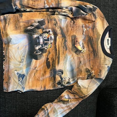 ensin oli paita liian iso, sitten poika. Sopii 134/140 kokoiselle.