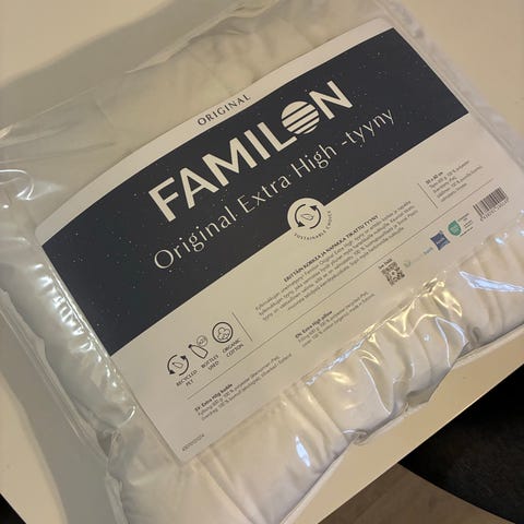 "Napakka ja erittäin korkea Familon Extra High -tyyny sopii kyljellään nukkuvalle tai harteikkaalle. Tyynyn paksu tikattu päällinen tekee siitä napakan tuntuisen ja normaalia korkeamman. Tikkityyny antaa oikean tuen päälle ja niskalle.