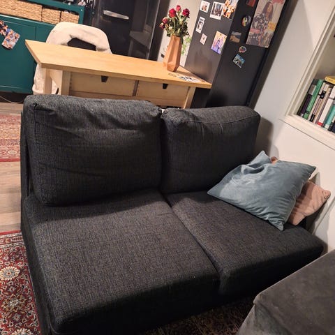 Beige, vähän flyysimäinen kahden istuttava kangassohva. Kohtalaisessa kunnossa, käytetty, mutta ei isompia näkyviä tahroja, ehjä. Päälliset täysin irrotettavissa ja pestävissä. Nouto Sörnäinen.