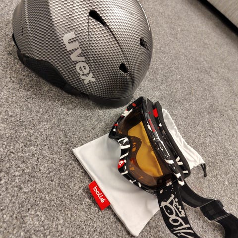Kypärällä on noin 5 laskukertaa ja se on vuoden vanha. Lasit ovat n. 3v vanhat.