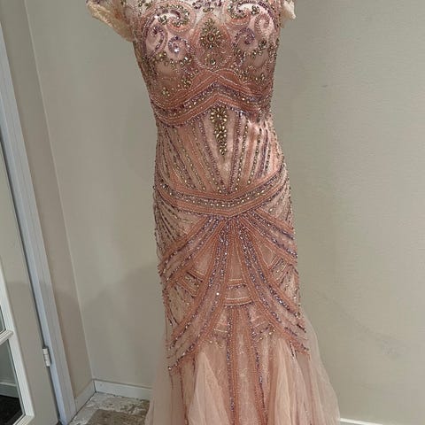 Tyylikäs ja näyttävä pitkä juhlapuku kauniissa tummansinisessä sävyssä. Mekko on kauttaaltaan koristeltu runsaalla helmikirjailulla, joka säihkyy upeasti valossa. Täydellinen häihin, iltajuhliin, gaalaan tai muihin arvokkaisiin tilaisuuksiin.