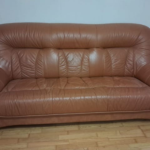 Tollanen vanha tekonahkasohva, joskus askosta ostettu. Vasemman puolen vipu ei toimi