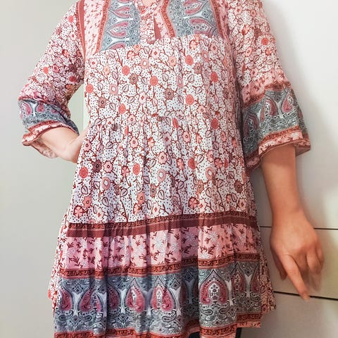 Ihana viskoosimekko kivoilla yksityiskohdilla. Hihansuissa nauhat, helmassa kerrostus, v-kaula-aukko ja vyötäröllä kuminauha. Mekko on uuttavastaavassa kunnossa.