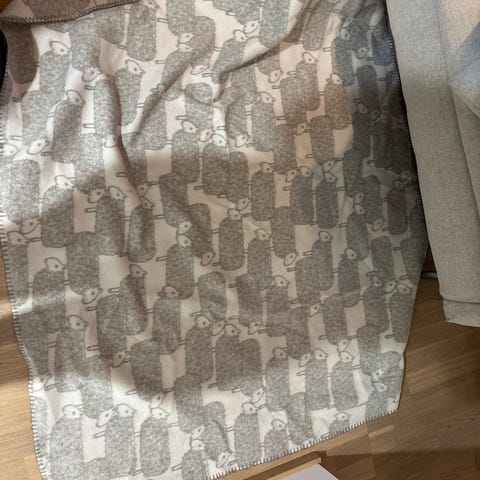 Käyttämättä jäänyt Nanson vaaleansinisen ja valkoisen kirjava torkkupeitto puuvillaa. Hapsut reunoissa. Koko n. 130 x 170 cm.