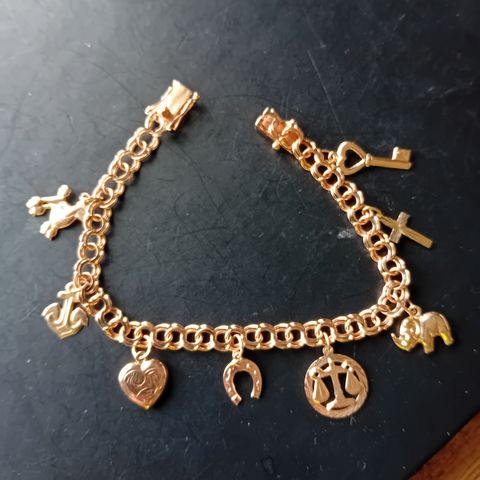 Bicmark rannekoru,kulta, jossa 11 amulettia. Kaikki kultaa 585/14kar. Rannekorun pit.19cm,lev 5mm,paino 14g. On kuin uusi. H.820/tarjous