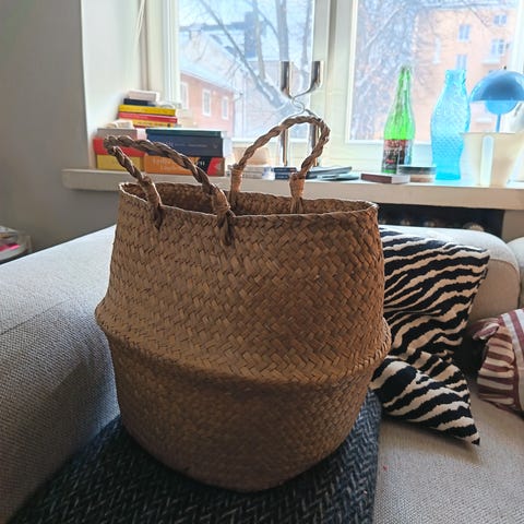 säilytyskori, korkeus n. 22cm, halkaisija leveimmästä kohdasta n. 33cm. ostettu muistaakseni ikeasta mutta en ole aivan varma