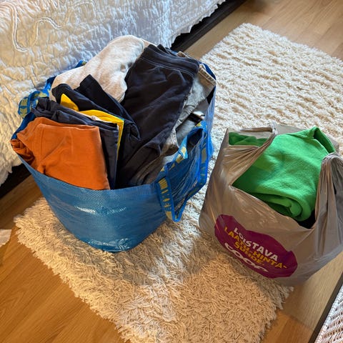 Vaatteiden kunto vaihtelee: osa on hyväkuntoisia, osassa on vikaa tai kulumaa. Tämän vuoksi myydään edullisena pakettina.