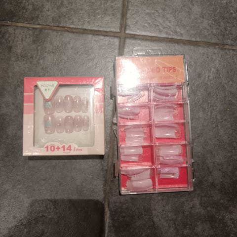 Uudet käyttämättömät tekokynnet. Sisältää myös pienen kynsiviilan ja kynsiliiman, joka saattaa olla jo kuivunut.