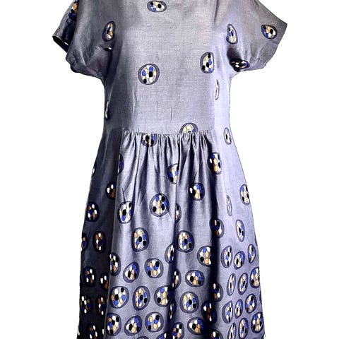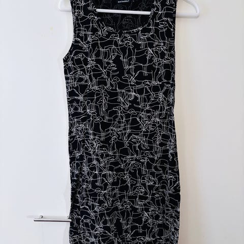 MARIMEKKO UTU kangasmekko 34-36. Materiaali ohuehko puuvillakangas, kangasvuori. Musta-luonnonvalkoinen kuviointi. Takana vetoketju, irrallinen kangasvyö. Upea mekko, sopii arkeen ja juhlaan.
