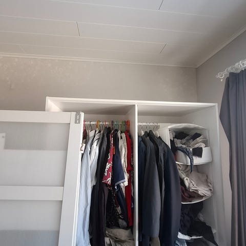 Väri tummanruskea, päällystetty valkealla fixillä. Sisällä vaatetangot, korit ja hyllyt. Peliovi hieman kupera. Lisäkuvia kommenteissa. Puretaan valmiiksi. Mielellään nopsa nouto koska on tilaa vievä.