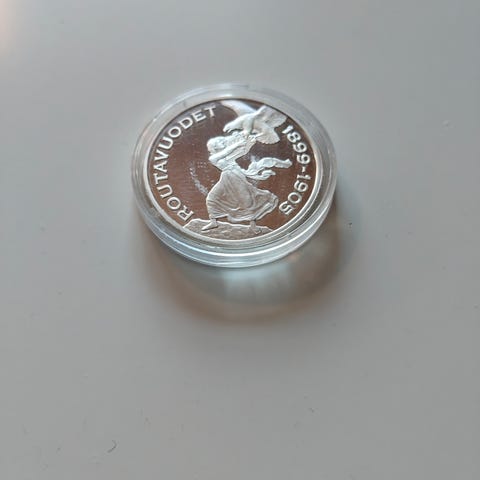 Säilytyskapselissa säilytetty hopearaha. Paino 26g. Nouto tai postitus.