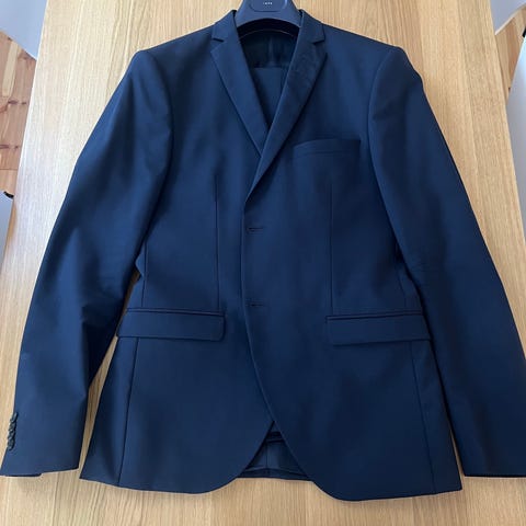 Siistissä kunnossa oleva lähes musta miesten puku koossa 48 seuraavalle.