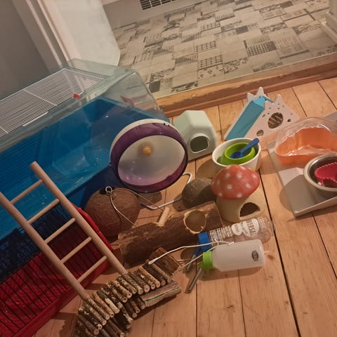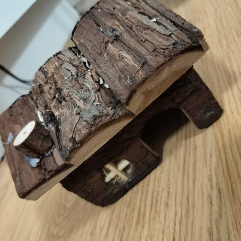 Labyrinttitalo pienille jyrsijöille. Kaksi sisäänkäyntiä ja pieni herkkukuppi sisällä. Edessä pleksilasi.