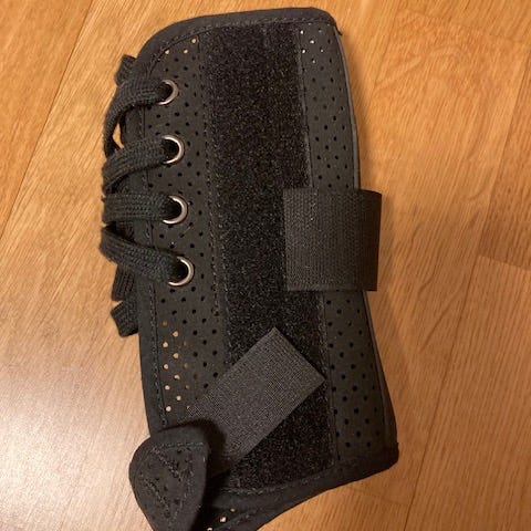 Uusi, käyttämätön rannetuki, jossa on sisäinen tukilasta ranteen tukemiseen. Tuki kiinnitetään tarranauhoilla, ja siinä on peukaloaukko, joka auttaa pitämään tuen paikallaan. Tuote soveltuu ranteen tukemiseen esimerkiksi rasitus- tai kiputilanteissa. Koko M.