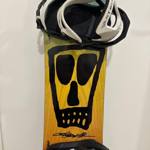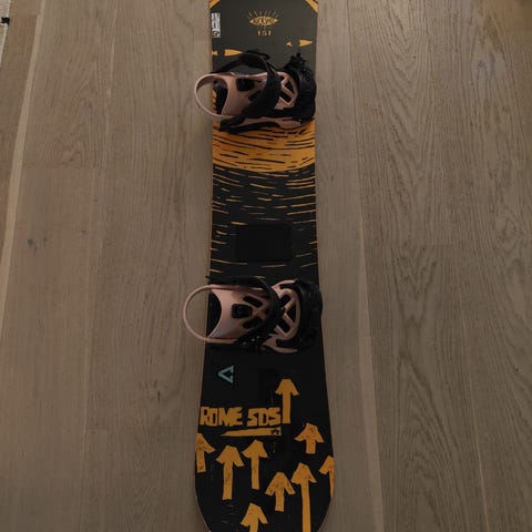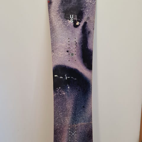 Pohjassa on naarmuja ja yksi syvempi kohta, joka on paikattu vihreällä materiaalilla — se ei vaikuta laskutuntumaan. Lauta tarvitsee myös voitelua ja kanttien teroitusta. En ole käyttänyt lautaa kolmeen talveen, koska lasken toisella laudalla.