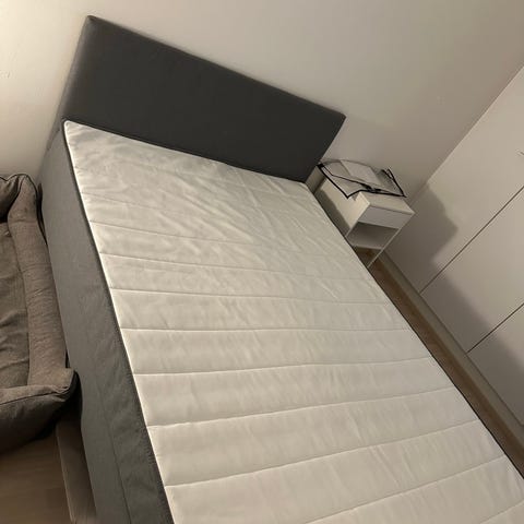IKEA sänky tummanharmaalla verhoilulla. Kokonaisuus koostuu alustasta ja patjasta, jotka muodostavat yhtenäisen, suorakaiteen muotoisen nukkumapinnan. Sänky sopii makuuhuoneeseen yhden tai kahden hengen käyttöön mittojen mukaan. Verhoilu on tummanharmaa kangas, ja sänky sijoittuu suoraan lattialle tai erillisille jaloille, jos sellaiset lisätään. Soveltuu käytettäväksi tavallisten vuodevaatteiden ja sijauspatjan kanssa. Ei ole käytönjälkiä. Ollut vierashuoneessa.