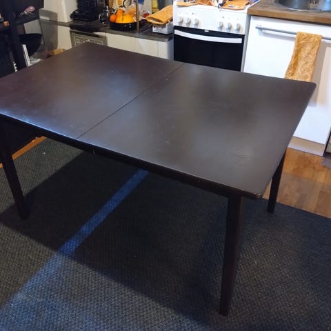 Vanha ruokailuryhmä, paljon elämää nähnyt ja jälkiä on. Yksi tuoleista todella hutera eikä ole ollut meillä enää. Uskoisin että korjattavissa kuitenkin vielä.