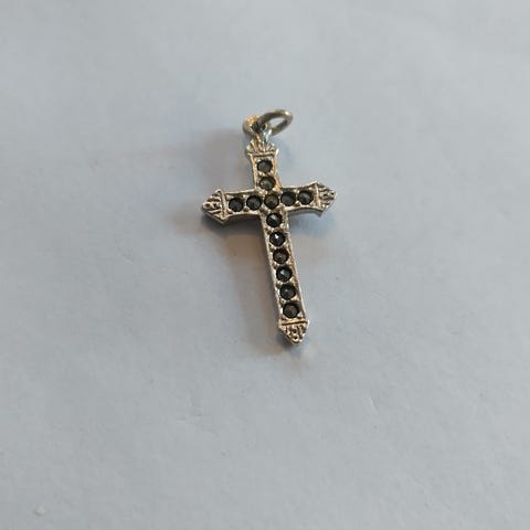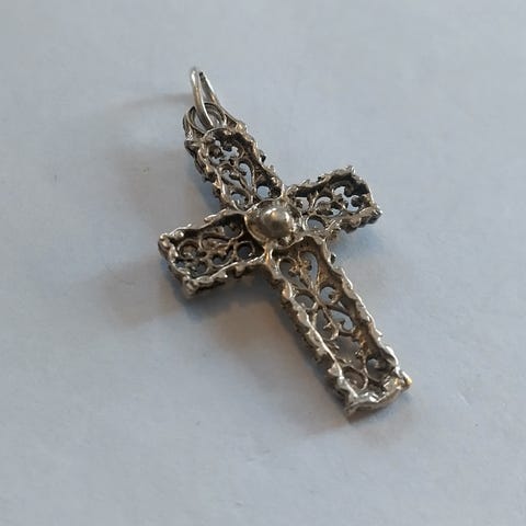 Kaunis vanha antiikkinen hopeinen (830) risti. Ristin korkeus lenkin päähän 44mm ja leveys 26mm. Nouto Hyvinkää/Mäntsälä tai postitus.