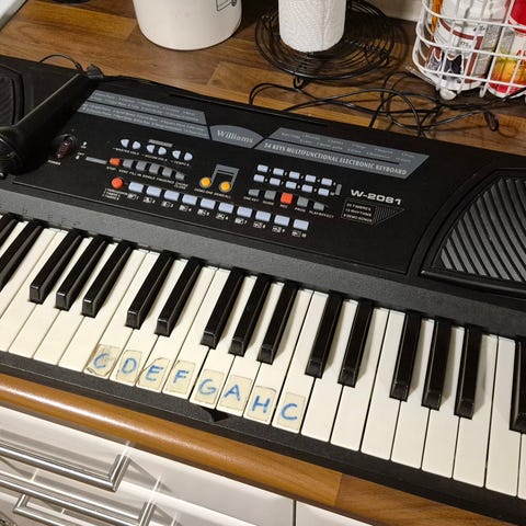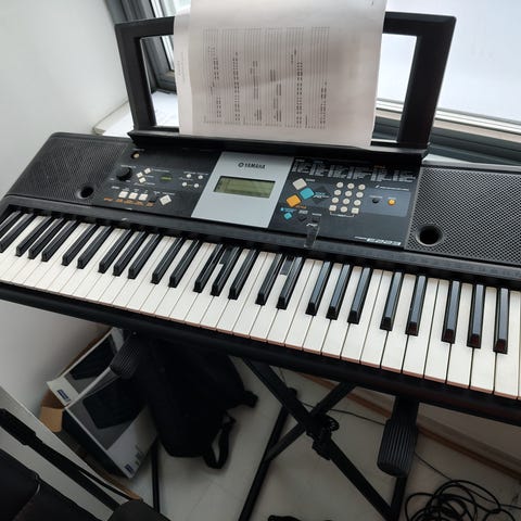 Kosketinsoitin jalustalla ja nuottitelineellä. Valkoiset koskettimet kellastuneet, muuten hyvä. Vain nouto, Vantaanlaakso.