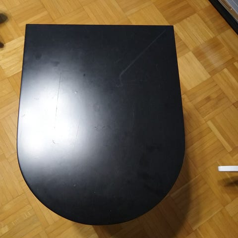 IKEAN pieni musta metallinen ,puujalkainen pöytä.