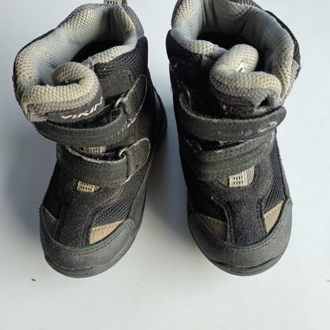 Siniset nahkaiset Eccon välikausikengät kokoa 23. Kevyet kengät ja vetoketju sisäsivulla helpottaa pukemista. Vuori on lämmin kylmiin kevätkeleihin, muttei ehkä pakkasille. Vedenpitävyydestä en anna takeita. Ostettu meille käytettynä, meillä olivat käytössä yhden kevään.