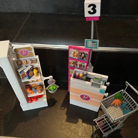 Barbien food truck, jossa auto avautuu isoksi myyntitasoksi. Mukana juomia, ruokaa ja muuta pikkutarviketta. Pari osaa kadonnut matkan varrella ja pari tarraa on hieman ottanut osumaa, mutta saa varmasti kiinnitettyä vaikka pikaliimalla. Kuvia ohessa.