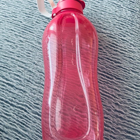 Tupperware Eco juomapullo. Läpinäkyvä muovinen pullo, jossa kierrekorkki ja läppäkansi juomanokalla. Soveltuu veden ja muiden juomien säilyttämiseen ja kuljettamiseen.