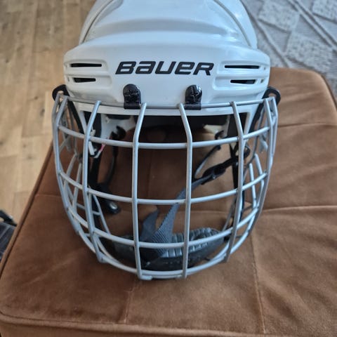 Bauer 5100 jääkiekkokypärä ristikkosuojalla. Kypärä on musta ja siinä on irrotettava metallinen kasvoristikko. Sisäpuolella on pehmusteet ja ilmanvaihtoaukot. Mallimerkintä BHH5100M. Ollut käytössä 8 vuotiaalla.